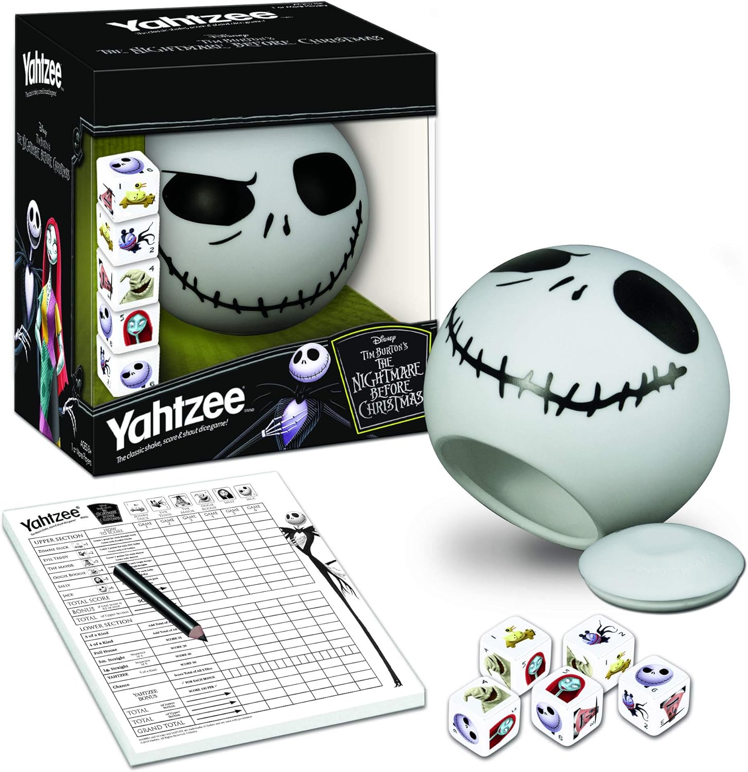 Play Americas all-time #1 Dice Game with The Nightmare Before Christmas YAHTZEE. Ready for you to shake it up are custom dice featuring frightful movie characters including the Mayor, Oogie Boogie, Sally and the Pumpkin King himself.