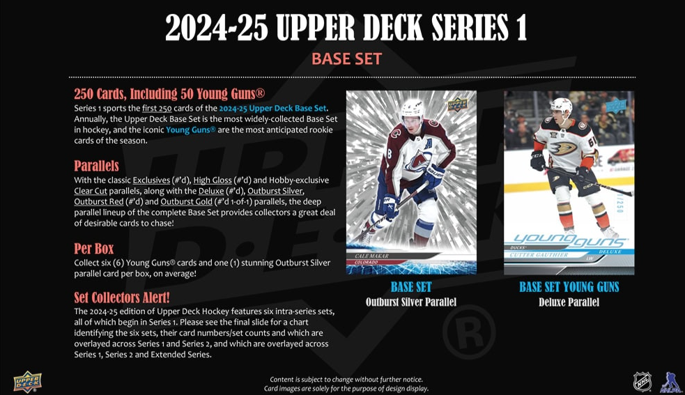 Series 1 sports the first 250 cards of the 2024-25 Upper Deck Base Set. Annually, the Upper Deck Base Set is the most widely-collected Base Set in hockey. It includes 198 veteran cards, 49 Young Guns® rookie cards and three checklist cards. The iconic Young Guns® are the most anticipated rookie cards of the season.